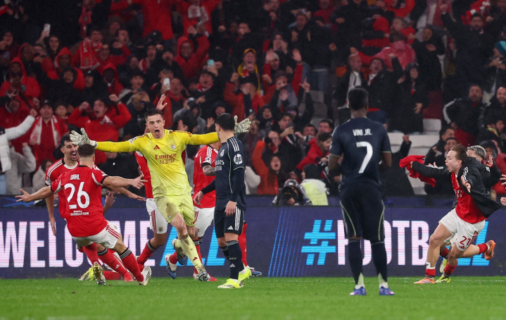 欧冠职业联赛 阶段最后一轮,本菲卡的对手正是皇马。当时本菲卡只有6分,而且净胜球也是负数,加上最后一轮的对手是皇马,本菲卡似乎不太可能完成虎口夺食的任务。穆里尼奥率领的本菲卡上演了获胜 大逃亡,他们在主场作战 先丢一球的情况下,4-2反转 皇马,门将特鲁宾读秒打进第4球,以-2净胜球优势力压-3净胜球马赛、帕福斯,成功拿到最后一个附加赛席位。