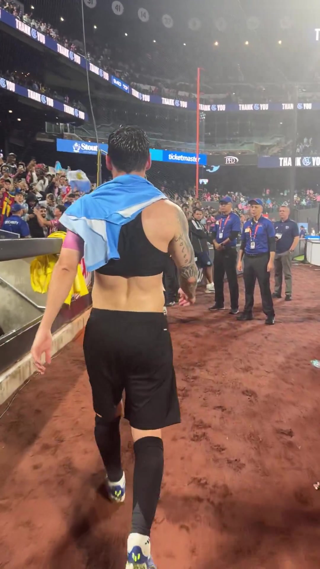 赛后梅西给一名残疾球迷签名,随后在球迷呐喊 声中离场