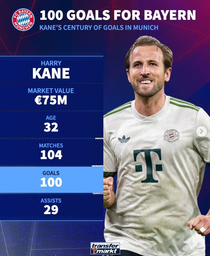 场均加入 超1球!凯恩为拜仁出场104次,打进100球还送出29次助功