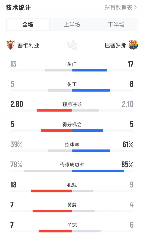 塞维利亚4-1巴萨全场数据:射球 13-17,射正5-8,盘带时间 39%-61%