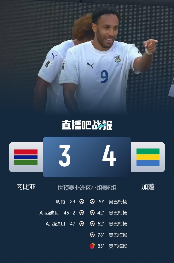 10月10日讯 世预赛非洲区F组第9轮赛事 ,加蓬客场应战 4-3战胜冈比亚,36岁的加蓬前场球员奥巴梅扬上演大四喜,一己之力为加蓬拿下了这场获胜 !