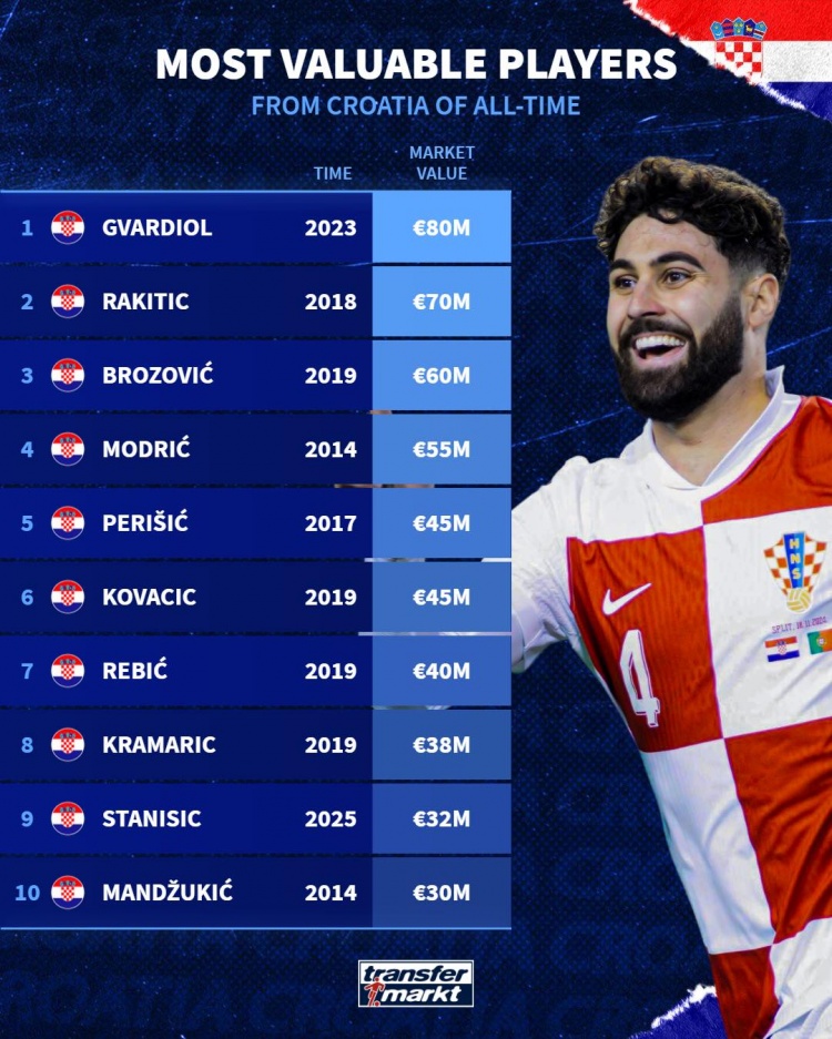 克罗地亚球员历史身价榜:格瓦迪奥尔8000万欧居首,拉基蒂奇次席