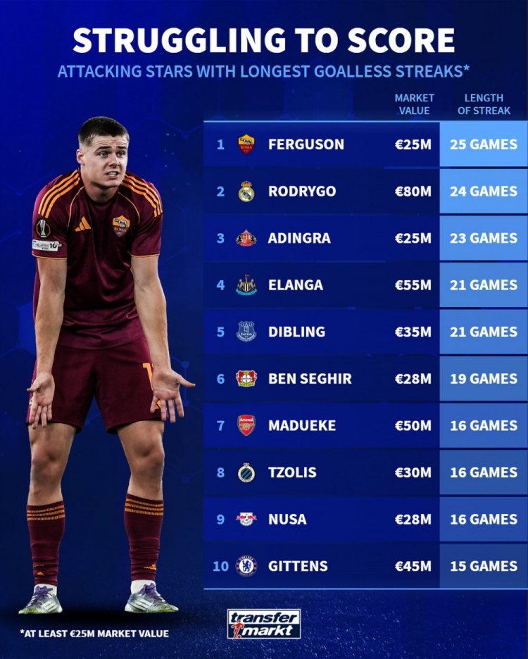 10月25日讯 德国转会市场盘点了攻击 球员得分 荒场次,并列出榜单,乒乓球特讯埃文-弗格森25场,罗德里戈24场。