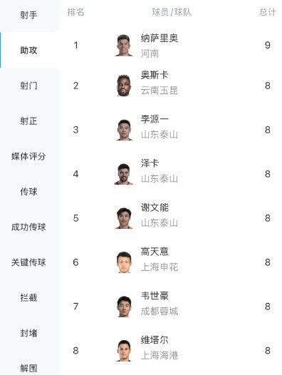 中超助功 榜:纳萨里奥9次领跑,奥斯卡、泽卡、韦世豪等7人8次
