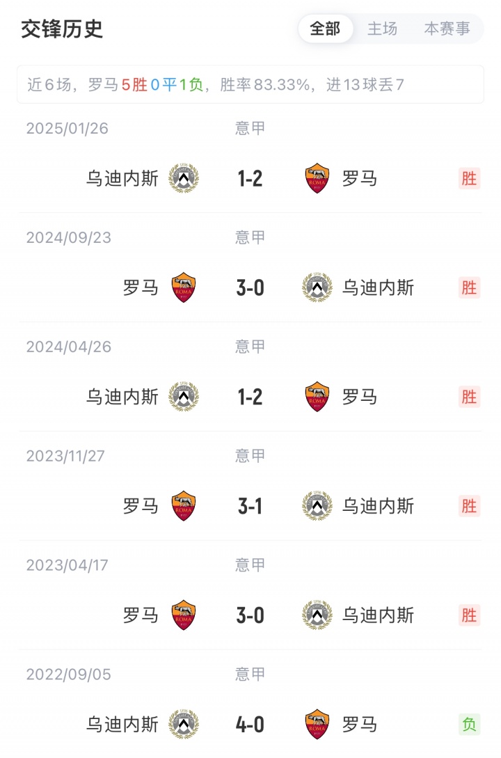 罗马职业联赛 7胜3负积21分,乌迪内斯职业联赛 4胜3平3负积15分。罗马对阵乌迪内斯已获5连胜。