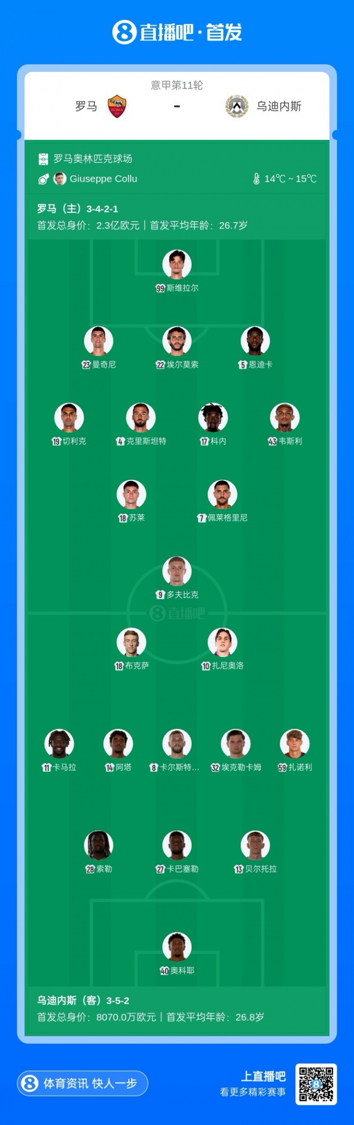 罗马vs乌迪内斯杆位:多夫比克、佩莱格里尼先发,苏莱、科内出战