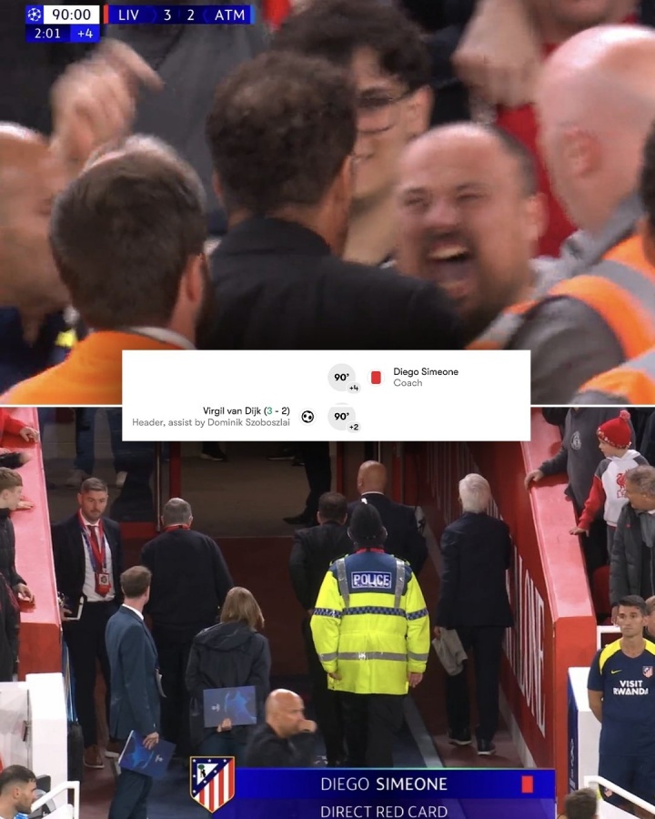 心态崩了!西蒙尼被致胜球 后与利物浦球迷发生冲突,被直红罚下