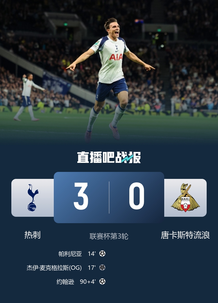 职业联赛 杯第3轮,热刺3-0战胜唐卡斯特流浪,帕利尼亚倒钩得分 。