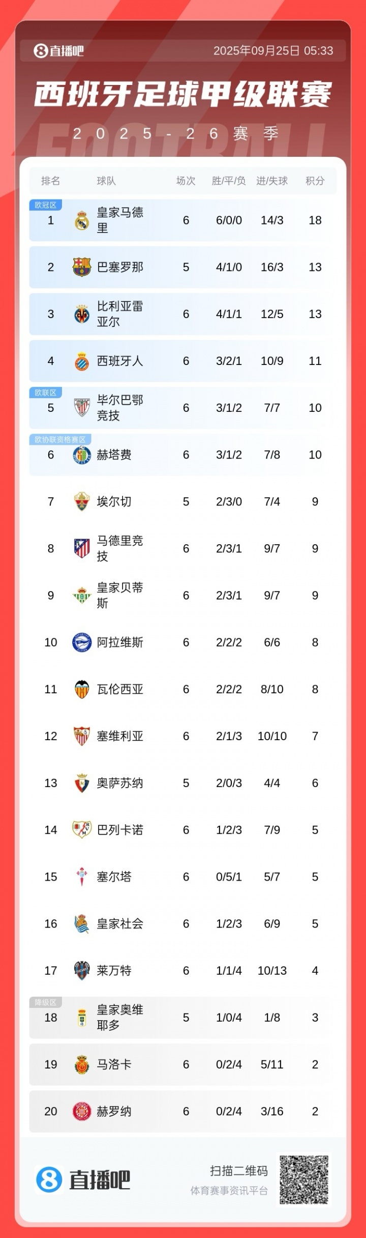 小蜘蛛救主!西甲积分榜:马竞致胜球 升至第8,皇马5分领跑 巴萨第2
