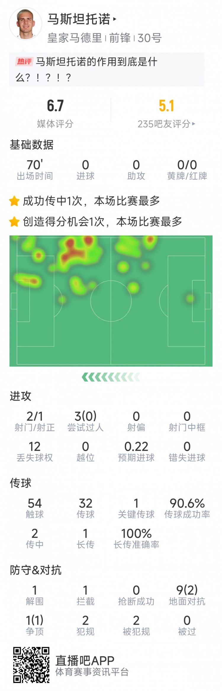 10月1日讯 在本轮欧冠,英超特讯皇马5-0大胜阿拉木图凯拉特。以下为马斯坦托诺本场数据: