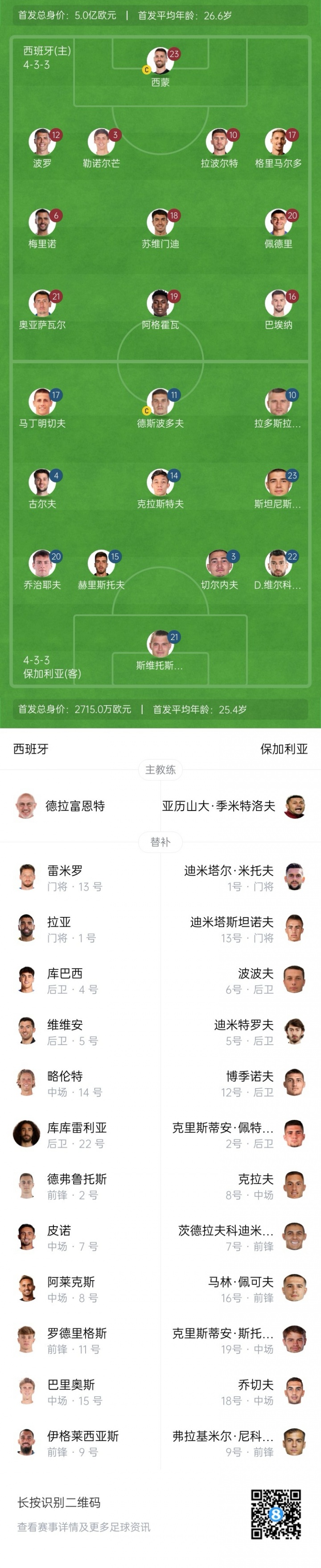 西班牙vs保加利亚杆位:佩德里先发,拉波尔特、巴埃纳出战