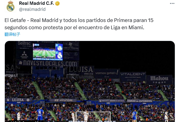 10月20日讯 西甲第9轮,皇马客战赫塔费,两队球员开场中止 15秒以抗议西甲海外赛,皇马也在社媒和官网发文。