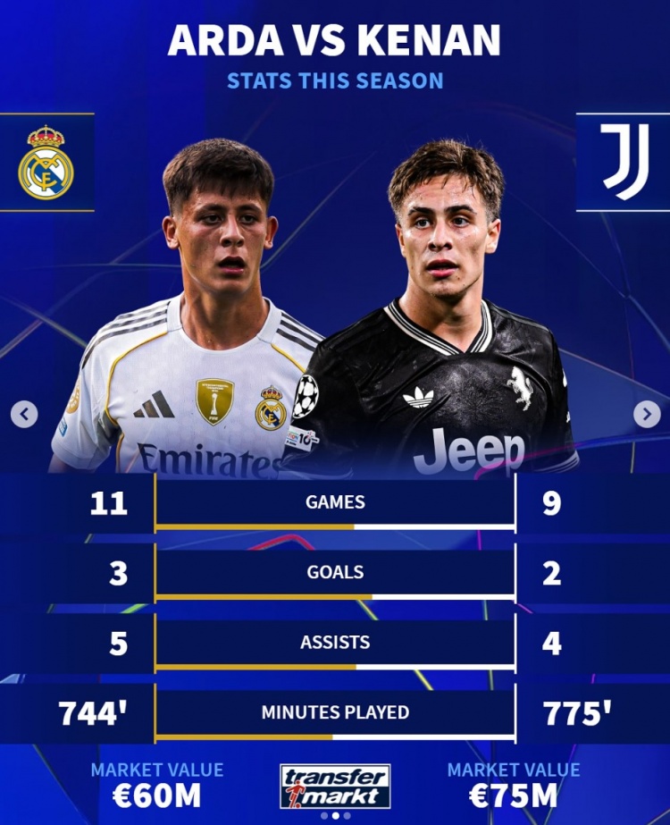 10月22日讯 尤文将在本轮欧冠焦点战客战皇马,同为20岁的土耳其双星将迎来正面对决,《转会市场》也列出了两人的本赛季关键数据对比: